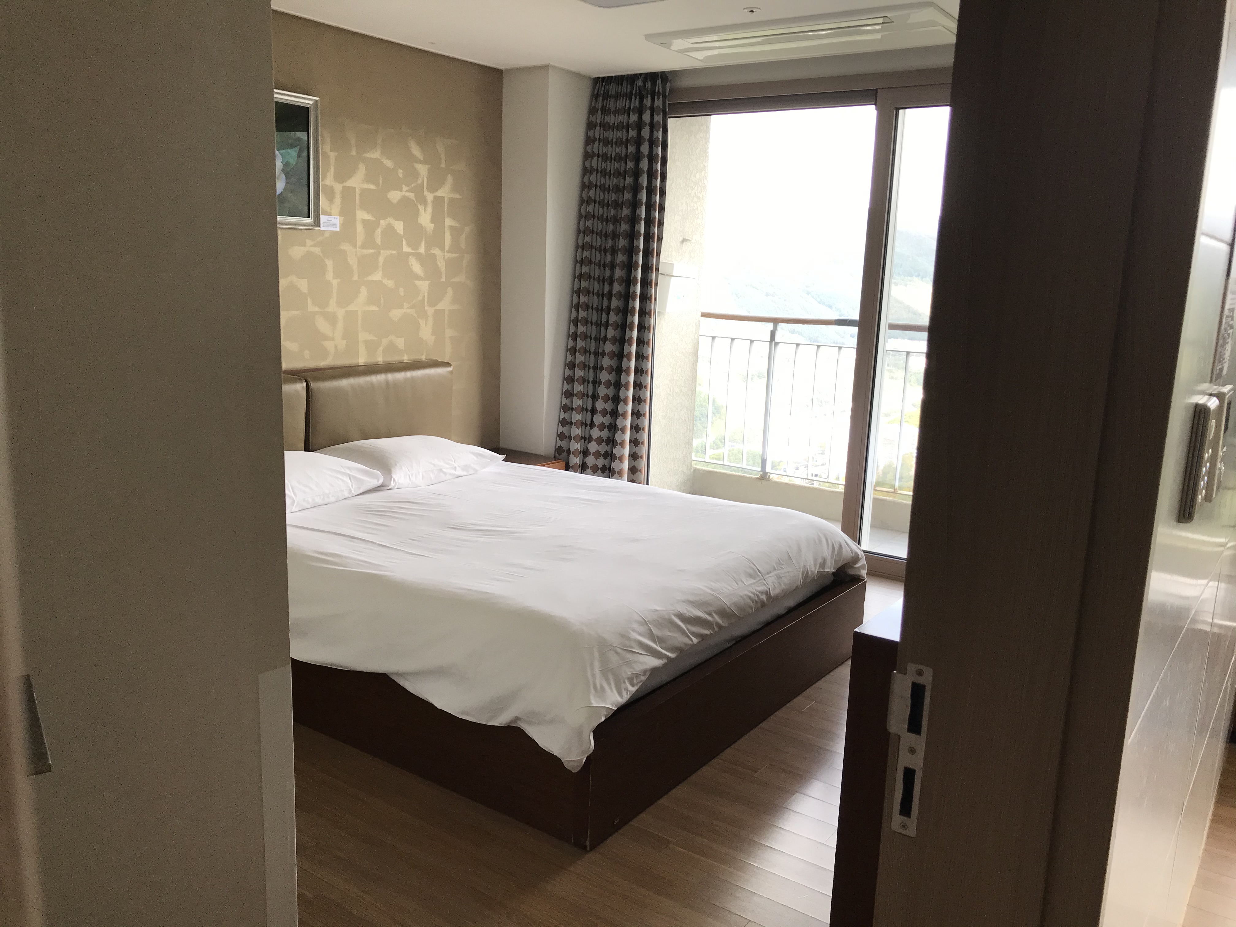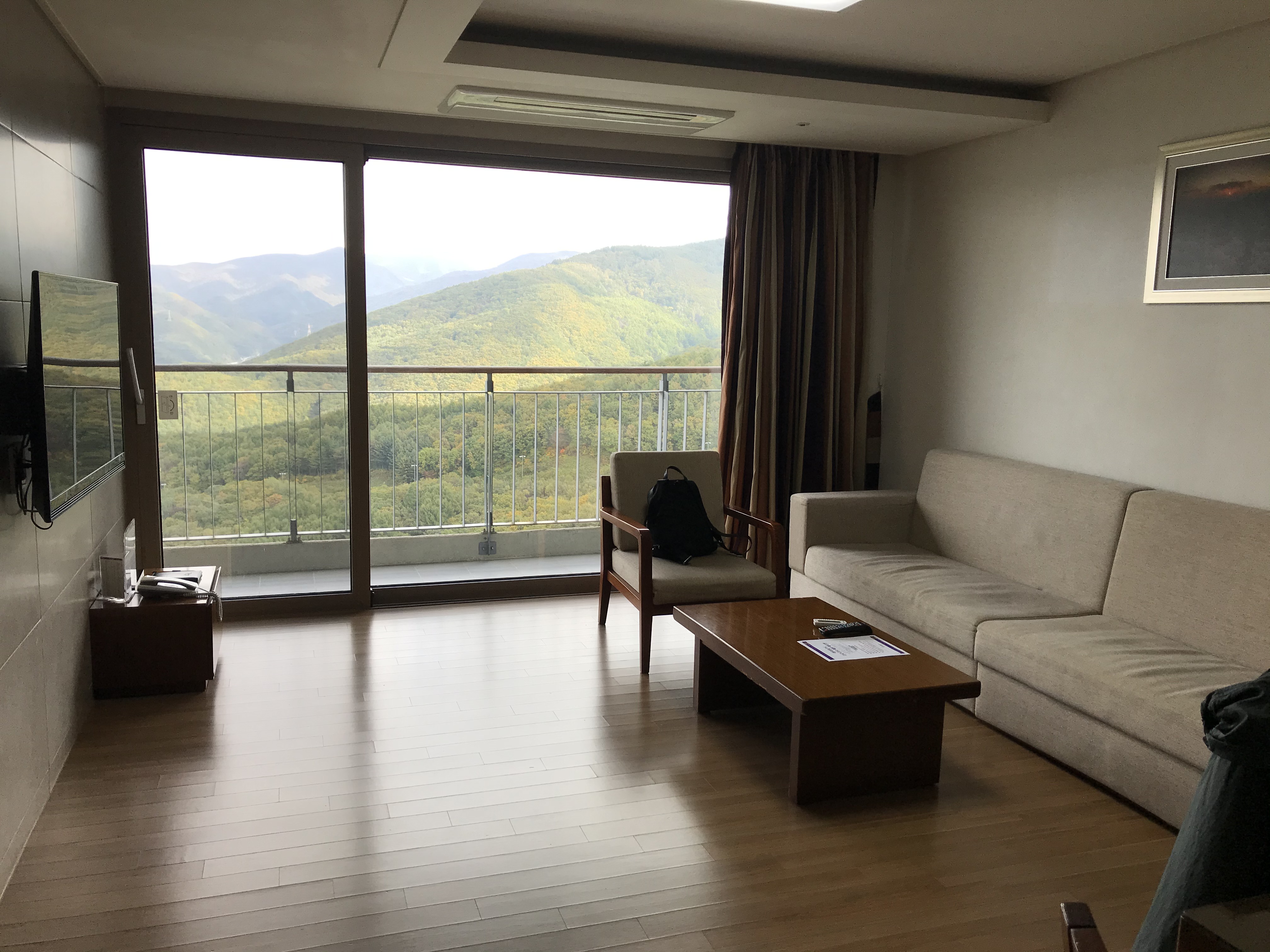 침대방과 거실은 산 풍경을 담고 있다. 넓고 산이 평화롭다.