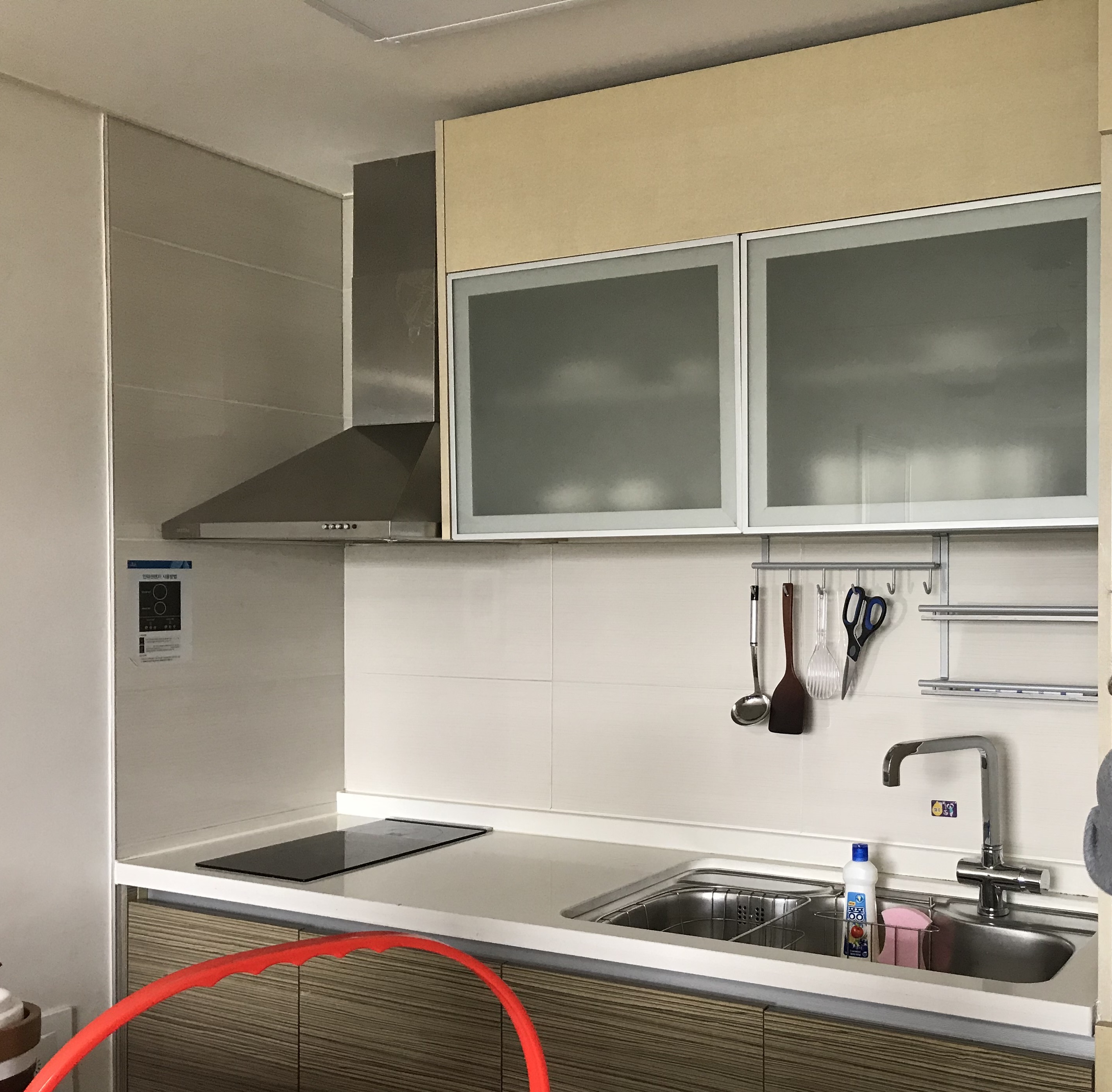 주방은 인덕션과 후드 식기류가 갖춰져있고 사진에 잘린 오른쪽에 빌트인으로 냉장고가 있다. 양문형의 반만한 사이즈이긴 하지만, 천장부터 아래까지 있기때문에 타 콘도에 비해 크고 세련됐다.