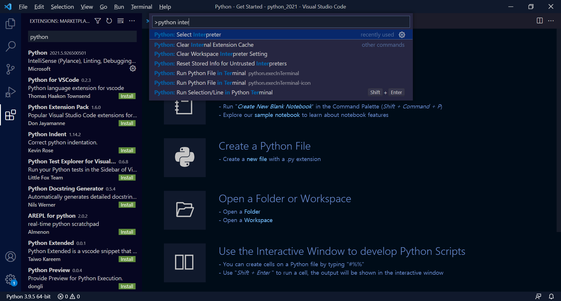 command palette에 python interpreter검색 후
