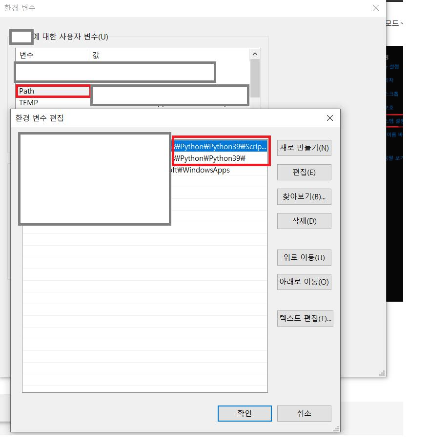 변수 중 PATH를 누르고 칸에 설치된 python의 경로와, 그 하위 script경로를 추가한 후 확인을 누른다.