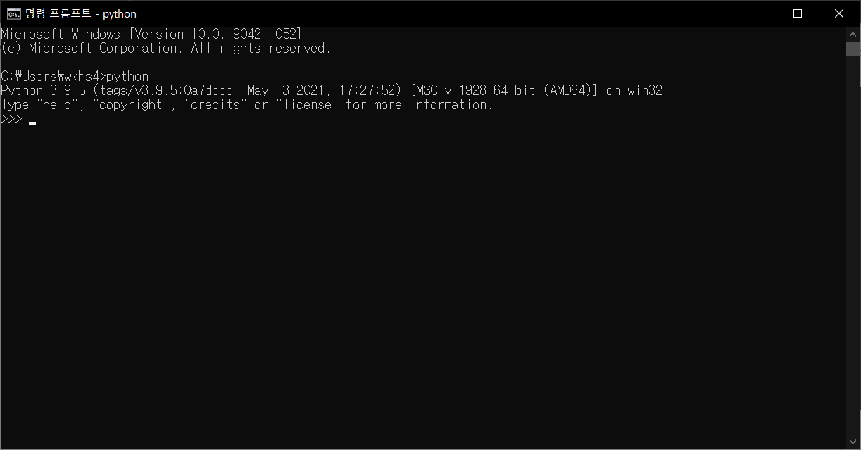 추가 후 명령프롬프트에 python을 치면 버젼을 포함한 간단한 정보가 출력되어야한다.