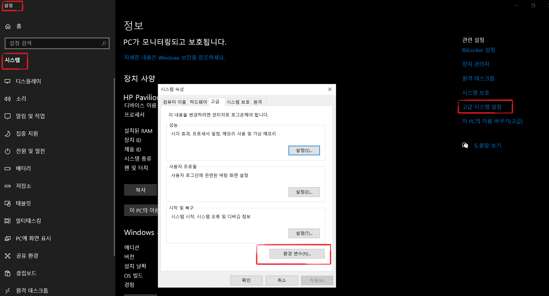 설정 - 시스템 - 고급시스템설정을 선택하면
