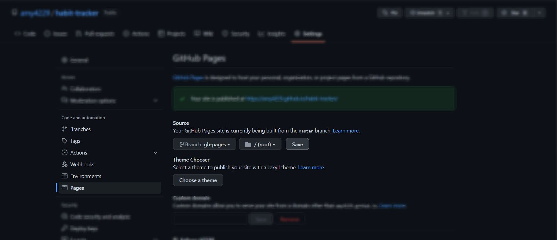 github pages의 source란에 branch gh-pages가 보일 것이다.