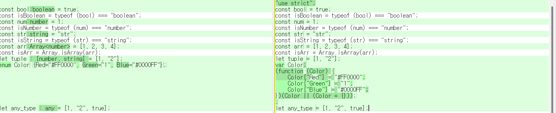 타입스크립트 playground에서 javascript의 변환 내용을 winmerge프로그램을 통해 비교한 결과